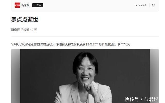 结语 四位名人的相继离世,让我们感到万分悲痛。 这四位逝者用各自的人生告诉我们,生命的价值不在长短,而在于深度与温度,尽管有人寿终正寝,有人英年早逝,有人低调谢幕,有人令人惋惜——但每个生命都值得被铭记。 死亡不是生命的终点,遗忘才是,只要我们还记得,那些离去的人就永远活在我们心中,愿逝者安息,生者坚强。 新京报罗点点逝世 抖音思丹
